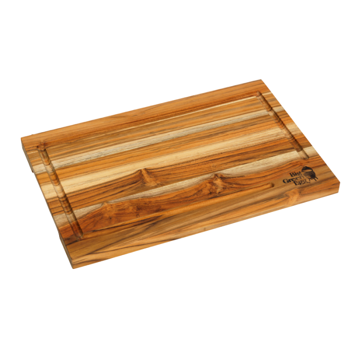 Das robuste Teakholz-Schneidebrett von Big Green Egg ist der perfekte Untergrund für das Tranchieren von schönen Fleischstücken oder das Schneiden oder Hacken von Gemüse und frischen Kräutern. Dank der ausgestanzten Griffe lässt sich das Schneidebrett gut anheben. Da dieses Brett ein echter Hingucker ist, lassen sich darauf auch gut Häppchen oder Käse servieren. Auf diese Weise können Sie auch dezent auf das mittels Laser eingebrannte Big Green Egg-Logo hinweisen.