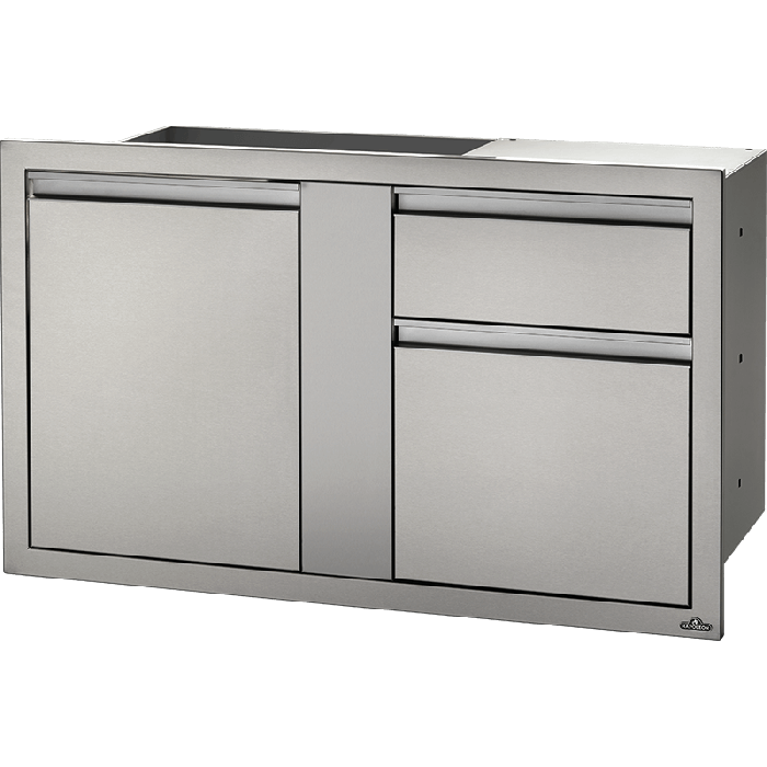 GROSSE EINZELTÜR & STANDARD-SCHUBLADE, 107 CM X 61 CM Die Gestaltung Ihrer eigenen Grillinsel war noch nie so einfach wie mit den Einbaukomponenten von Napoleon. In jeder tollen Outdoor-Küche braucht man Stauraum; dieses integrierte Bauteil (107 cm x 61 cm) bietet Ihnen den Stauraum, den Sie benötigen. Mit zwei großzügigen Schubladen und einer großen Einzeltür. Edelstahlkonstruktion, sanfte Schließtechnik, nahtlose Verarbeitung und Griffe aus eloxiertem Aluminium sorgen für Langlebigkeit und unzählige Montagemöglichkeiten.