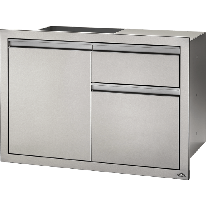 Die Gestaltung Ihrer eigenen Grillinsel war noch nie so einfach wie mit den Einbaukomponenten von Napoleon. In jeder tollen Outdoor-Küche braucht man Stauraum; dieses integrierte Bauteil (91 cm x 61 cm) bietet Ihnen den Stauraum, den Sie benötigen. Mit zwei großzügigen Schubladen und einer großen Einzeltür. Edelstahlkonstruktion, sanfte Schließtechnik, nahtlose Verarbeitung und Griffe aus eloxiertem Aluminium sorgen für Langlebigkeit und unzählige Montagemöglichkeiten.