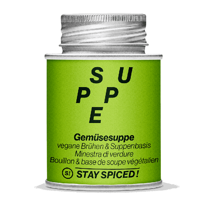 Mit der STAY SPICED ! Gemüsesuppe bereitest du im Handumdrehen eine Suppe mit einem angenehmen Geschmack nach feinem Gemüse und frischen Gartenkräutern zu. Für ein optimales Geschmackserlebnis verwende 15 g auf 1 Liter Flüssigkeit. Kurz aufkochen lassen und anschließend mit der gewünschten Suppeneinlage genießen. Selbstverständlich kann sie auch zum Abschmecken und Verfeinern von Saucen, Reis- und Gemüsepfannen und Salatdressings verwendet werden.