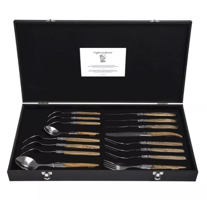 Für diejenigen, die wirklich auftrumpfen wollen, ist dieses luxuriöse Besteckset aus Olivenholz perfekt! Dieses 16-teilige Set besticht durch seine schicke Ausführung, die jeder Mahlzeit das gewisse Etwas verleiht. So haben Sie immer zufriedene Gäste an Ihrem Tisch! Das Besteckset aus der Luxury Line von Laguiole Style de Vie ist aus Edelstahl und Olivenholz gefertigt und daher nicht spülmaschinenfest. Die Dicke des Bestecksets beträgt 2,5 mm und es ist in einer schönen, luxuriösen, schwarzen Box verpackt. Sehr praktisch, um Ihr Besteck darin ordentlich zu verwahren.