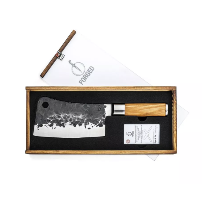 Mit dem asiatischen Hackmesser der Serie Olive hacken Sie grobe Stücke Fleisch und Gemüse. Außerdem lässt sich damit auch Geflügel mühelos portionieren. Dank des Gewichts und der Rundung der Klinge eignet sich ein Hackbeil ideal zum Hacken von Kräutern. Die Olive-Messer von Forged bestehen aus japanischem 440C Stahl mit einer Härte von 58 Rockwell. Alle Messer von Forged werden von Hand geschmiedet, weisen eine Klingenstärke von 2 mm und einen Schnittwinkel von 18 Grad auf. Verpackt in einer luxuriösen Holzbox. Die Messer werden mit einer 10-jährigen Garantie geliefert.